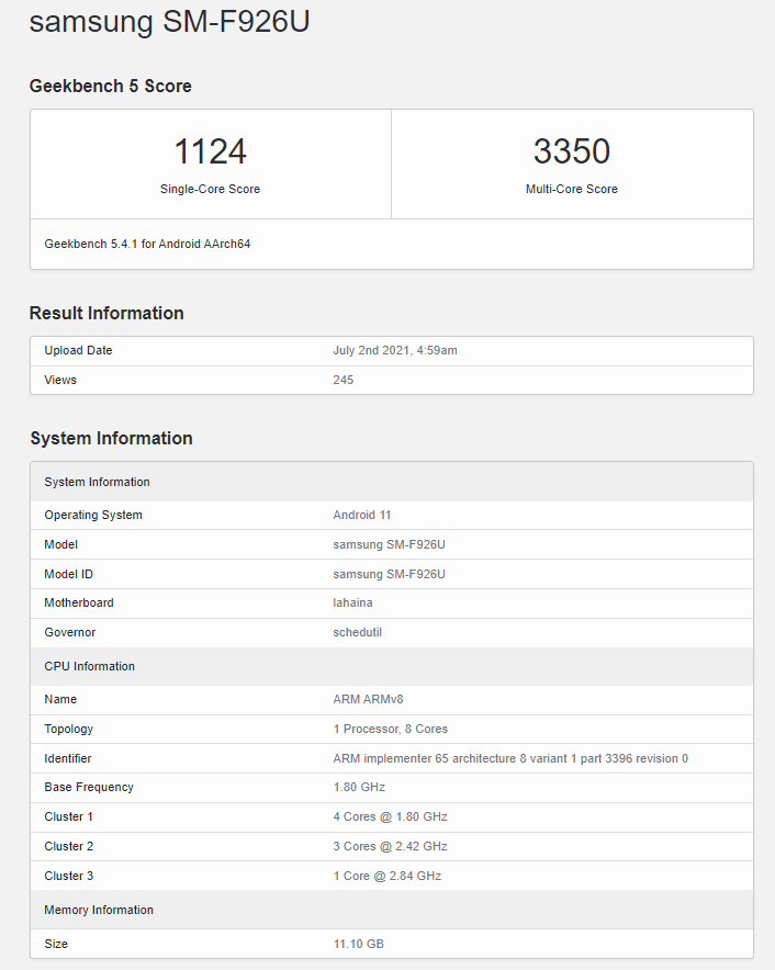 The Galaxy Z Fold 3 has popped up with Model No. — SM-F926U on Geekbench. This listing reveals it will be powered by Qualcomm’s Flagship SOC — Snapdragon 888 and will be paired with 12GB RAM. As it is a Geekbench listing it doesn’t reveal any more of its specs.