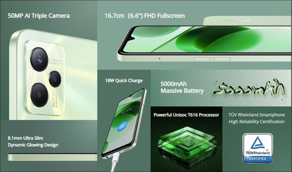 Realme C35 comes with 6.6 inch Full HD LCD display, it has 8MP f/2.0 front facing camera in a water drop style notch. On the rear-side for main cam setup, it has triple cam setup housing 50MP f/1.8 main lens, a 2MP f/2.4 Macro lens and a 2MP f/2.8 Monochrome sensor. It features a Micro-SD card slot for expandable storage, a USB type-c slot, 3.5mm audio jack and 5,000 mAh battery which supports 18W fast charging. Out of box it will be running on Android 11 OS with Realme UI R edition. It will be powered by Unisoc’s T616 SOC paired with 4/6GB LPDDR4X RAM and 64/128GB UFS 2.2 Storage respectively.